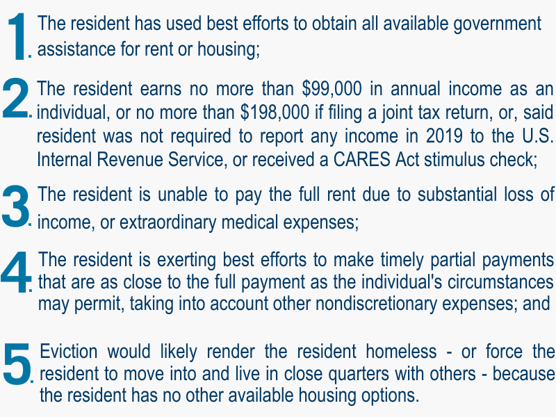 On October 22, 2020, the Michigan Supreme Court issued Administrative Order 2020-17 addressing the status of eviction cases.  As of September 4, 2020, the Center for Disease Control (CDC) issued an Order temporarily halting residential evictions nationwide to prevent the further spread of COVID-19. The order provides that an owner of a residential property, with a legal right to pursue eviction, shall not evict any covered resident from any residential property.  To be considered a covered resident under this order, the resident must provide the following in a sworn statement to the property owner: