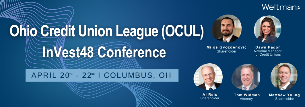 National Manager of Credit Unions Dawn Pagon; Shareholders Milos Gvozdenovic, Allen Reis, Matt Young; and Attorney Thomas Widman will exhibit at the Ohio Credit Union League (OCUL)'s InVest48 in Columbus, OH, from April 20th - 22nd. InVest48 is Ohio's largest credit union event with breakout sessions, educational events, and so much more! If you are attending, visit Dawn, Milos, AllenMatt, and Thomas at their booth or connect with them today to learn more about our credit union representation solutions!