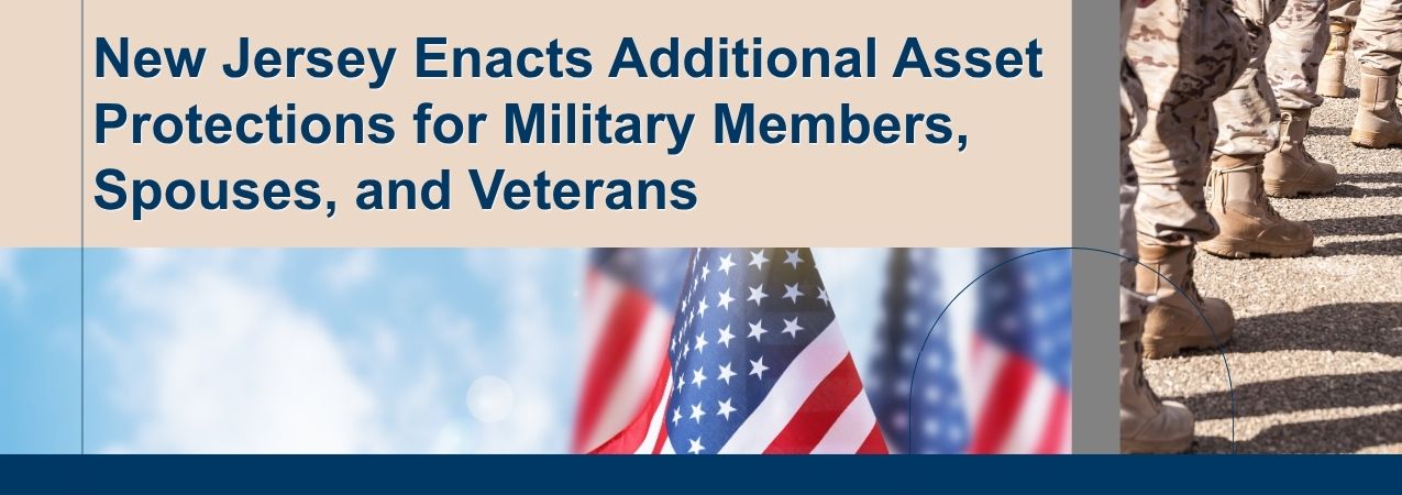 New Jersey Veterans and Military Spouses Asset Protection Act (the Act). The new law provides additional defenses and exemptions for those covered under the Act from post-judgment levies, garnishments, and the ability to force sales of property. The Legislature determined that due to the sacrifices made by veterans, active-duty service members, and their families enhanced creditor protections were necessary. The Act had immediate effect and applied retroactively to January 1, 2025, but only for debts incurred or claims filed on or after January 1, 2025.