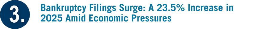 According to recently published data from Epiq Bankruptcy Analytics, the upward trend of bankruptcy filings continues nationwide. Total bankruptcy filings year-to-date in 2025 are up 23.5% over 2024, while total chapter 7 filings show a 19.8% increase, and chapter 13 filings show an 8.3% increase.