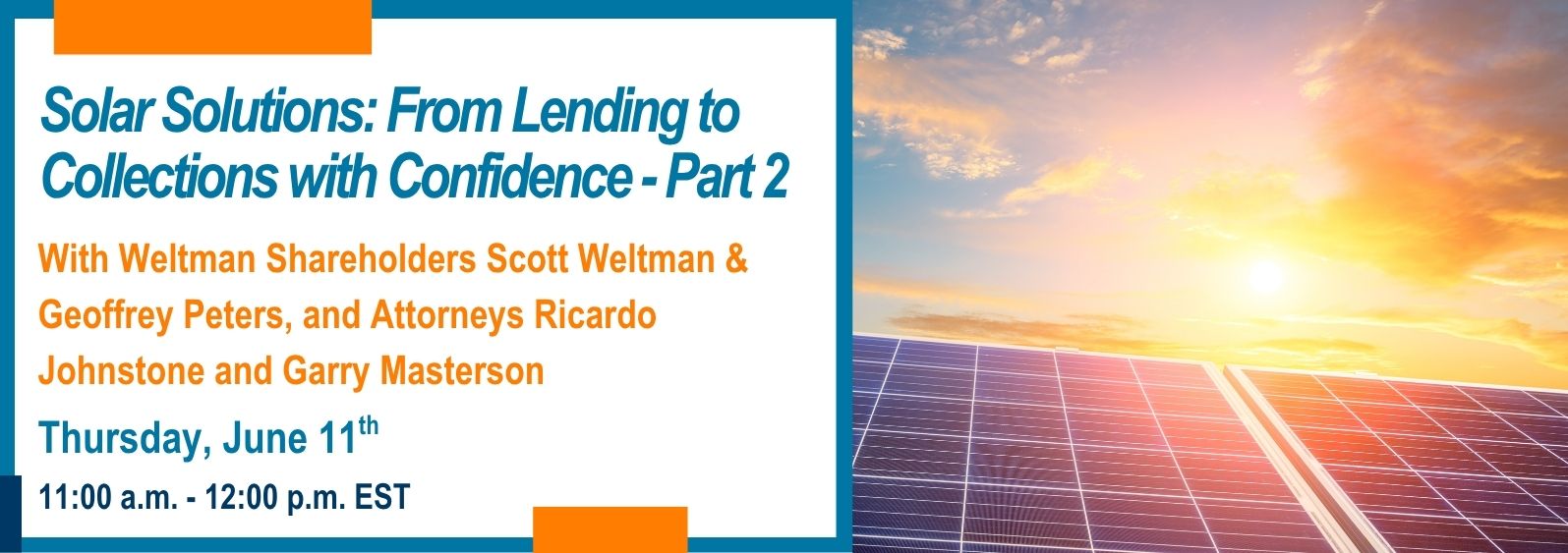 The solar industry continues to evolve, and so do the legal and operational challenges that come with it. Join Weltman Shareholders Scott Weltman and Geoffrey Peters, along with Attorneys Ricardo Johnstone and Garry Masterson, for Part 2 of our Solar Solutions webinar series.